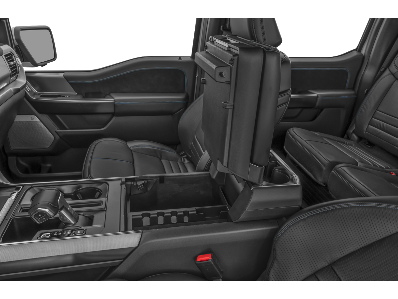 Equipment Group 702A High (Power-Deployable Running Boards, Radio: B&O Unleashed Sound System by Bang & Olufsen, Unique Multi-Contour Leather Bucket Seats, and Wheels: 20 Painted Gloss Ebony Black), Ford Connectivity Package (1-Year Included), FX4 Off-Road Package (4x4 FX4 Off-Road Bodyside Decal, Hill Descent Control, Monotube Rear Shocks, and Off-Road Tuned Front Shock Absorbers), GVWR: 7,400 lbs Payload Package, Internet access capable: 5G Modem - Ford Connectivity Package, 3.5L PowerBoost Full-Hybrid V6, 4WD, 4-Wheel Disc Brakes, 8 Speakers, ABS brakes, Adjustable pedals, Air Conditioning, Alloy wheels, AM/FM radio: SiriusXM with 360L, Auto High-beam Headlights, Auto tilt-away steering wheel, Auto-dimming door mirrors, Auto-dimming Rear-View mirror, Automatic temperature control, Brake assist, Bumpers: body-color, Compass, Delay-off headlights, Driver door bin, Driver vanity mirror, Driver's Side SecuriCode Keyless-Entry Keypad, Dual front impact airbags, Dual front side impact airbags, Electronic Stability Control, Emergency communication system: SYNC 4 911 Assist, Front anti-roll bar, Front Bucket Seats, Front Center Armrest, Front dual zone A/C, Front fog lights, Front License Plate Bracket, Front reading lights, Front wheel independent suspension, Fully automatic headlights, Garage door transmitter, Heated door mirrors, Heated front seats, Heated rear seats, Heated steering wheel, Illuminated entry, Leather steering wheel, Low tire pressure warning, Memory seat, Navigation system: Connected Navigation, Occupant sensing airbag, Outside temperature display, Overhead airbag, Overhead console, Panic alarm, Passenger door bin, Passenger vanity mirror, Pedal memory, Power door mirrors, Power driver seat, Power passenger seat, Power steering, Power windows, Radio data system, Radio: B&O Sound System by Bang and Olufsen, Rain sensing wipers, Rear reading lights, Rear seat center armrest, Rear step bumper, Rear window defroster, Remote keyless entry, Security system, Speed control, Split folding rear seat, Steering wheel memory, Steering wheel mounted audio controls, SYNC 4 with Enhanced Voice Recognition, Tachometer, Telescoping steering wheel, Tilt steering wheel, Traction control, Tray Style Floor Liner, Trip computer, Turn signal indicator mirrors, Twin Panel Moonroof, Variably intermittent wipers, and Ventilated front seats.
