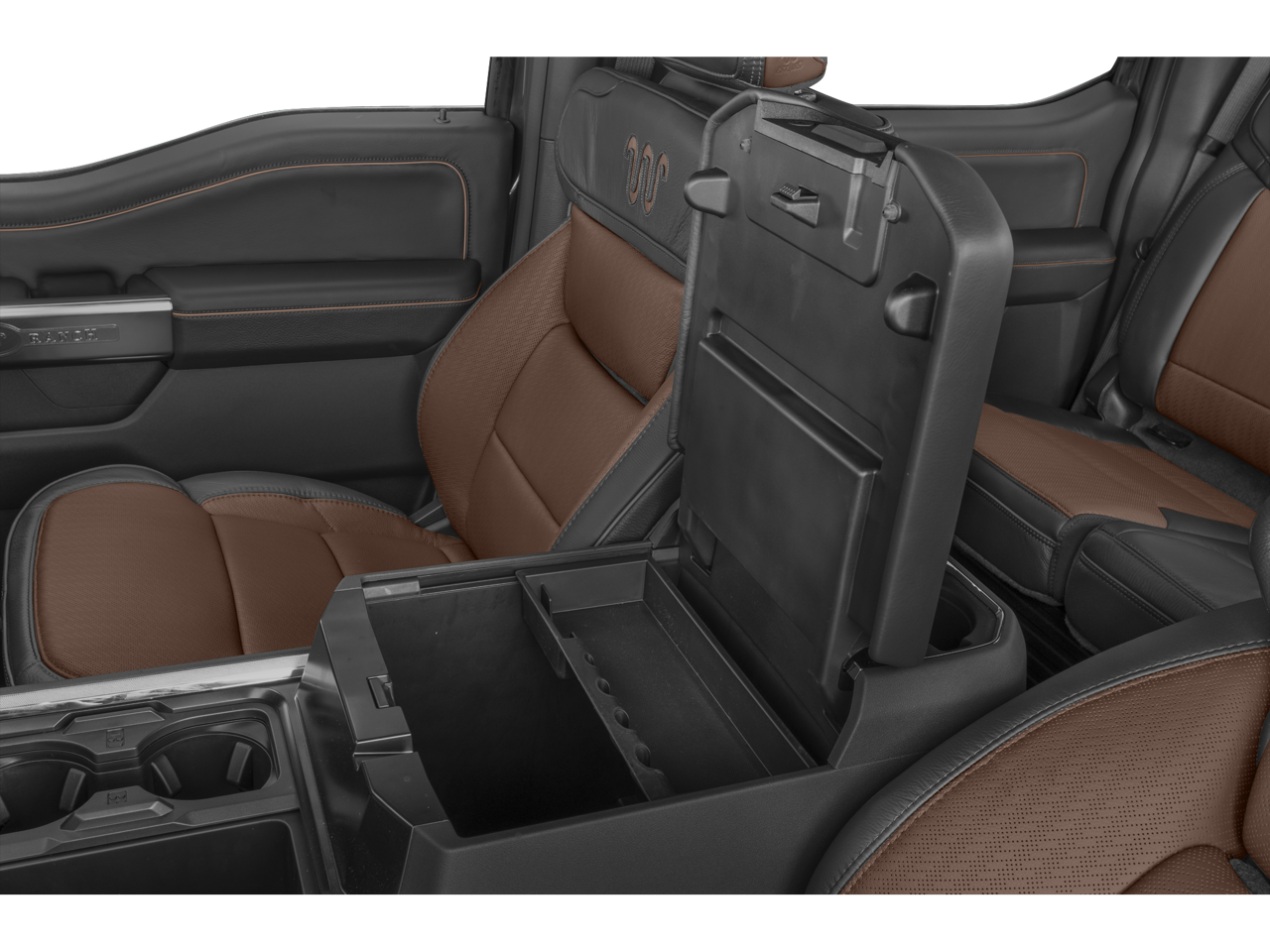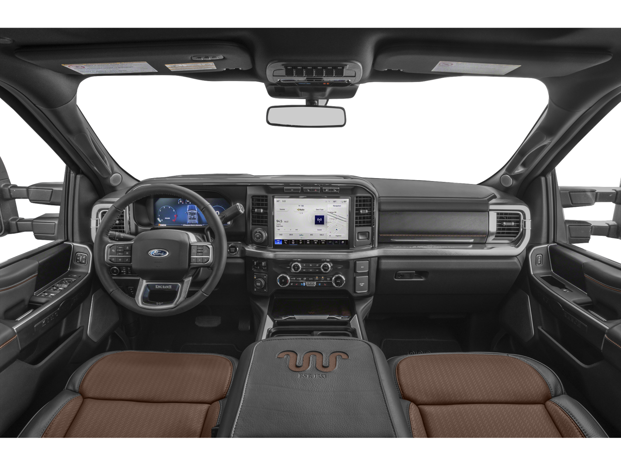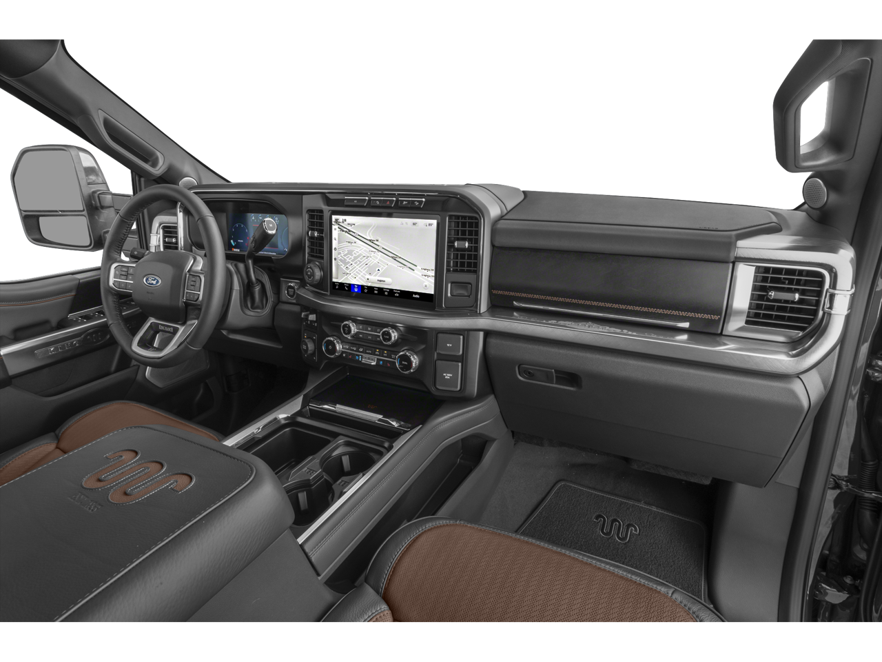 5th Wheel/Gooseneck Hitch Prep Package, Ford Connectivity Package (1-Year Included), FX4 Off-Road Package (Hill Descent Control, Off-Road Specifically Tuned Shock Absorbers, and Unique FX4 Off-Road Box Decal), Internet access capable: 5G Modem - Ford Connectivity Package, Order Code 710A (Flow-Through Console, Radio: B&O Unleashed Sound System by Bang & Olufsen, SiriusXM with 360L, SYNC 4 with Enhanced Voice Recognition, Unique King Ranch Leather 40/Console/40 Seats, and Wheels: 20 Bright Machined Aluminum), Snow Plow Prep Package, 4WD, 14 Speakers, 4-Wheel Disc Brakes, ABS brakes, Adjustable pedals, Air Conditioning, Alloy wheels, AM/FM radio: SiriusXM with 360L, Auto High-beam Headlights, Auto tilt-away steering wheel, Auto-dimming Rear-View mirror, Automatic temperature control, Brake assist, Compass, Delay-off headlights, Driver door bin, Driver vanity mirror, Dual front impact airbags, Dual front side impact airbags, Electronic Stability Control, Emergency communication system: SYNC 4 911 Assist, Engine Block Heater, Front anti-roll bar, Front Bucket Seats, Front Center Armrest, Front dual zone A/C, Front fog lights, Front reading lights, Fully automatic headlights, Garage door transmitter, Heads-Up Display, Heated door mirrors, Heated front seats, Heated rear seats, Heated steering wheel, Illuminated entry, Leather steering wheel, LED Roof Clearance Lights, Low tire pressure warning, Memory seat, Navigation system: Connected Navigation, Outside temperature display, Overhead airbag, Overhead console, Panic alarm, Passenger door bin, Passenger vanity mirror, Pedal memory, Power door mirrors, Power driver seat, Power passenger seat, Power steering, Power windows, Pro Power Onboard - 2kW, Rain sensing wipers, Rear reading lights, Rear seat center armrest, Rear step bumper, Rear window defroster, Remote keyless entry, Security system, Speed control, Split folding rear seat, Steering wheel memory, Steering wheel mounted A/C controls, Steering wheel mounted audio controls, Tachometer, Telescoping steering wheel, Tilt steering wheel, Traction control, Trip computer, Turn signal indicator mirrors, Twin Panel Power Moonroof, Upfitter Switches (6), Variably intermittent wipers, and Ventilated front seats.